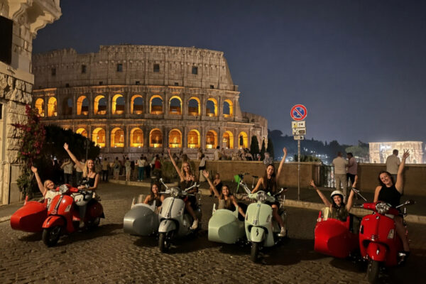 Arriveremo silenziosamente, accarezzati dal vento, davanti al Colosseo per ammirarlo in tutta la sua maestosità. Ci fermeremo per scattare foto o girare video, poi ripartiremo con i nostri sidecar Vespa per compiere il giro completo dell’anfiteatro fino a raggiungere il Circo Massimo.
